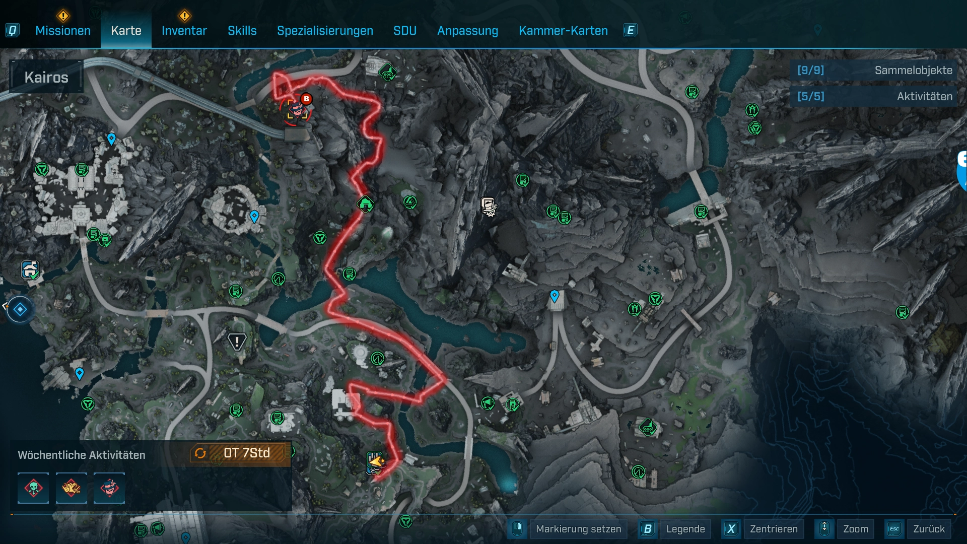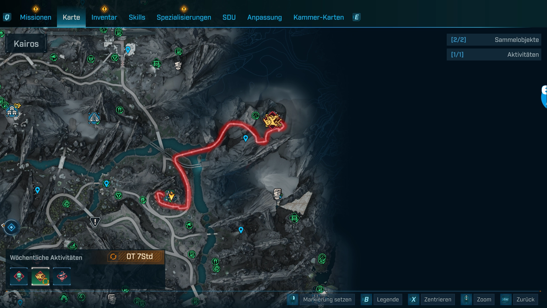 Eine wiederholbare Story-Mission mit Elite-Gegnern, wöchentlichen Modifikationen der Gegner und einem garantierten Legendären Item am Ende. Ideal für Solo & Koop — erwarte intensive Gefechte und variierende Loot-Rolls. Die Wildcard Mission kannst du starten und sehen welche Modifikationen aktiv sind, kannst du, wenn du auf die Karte klickst und unten links über das Symbol der wöchtenlichen Aktivitäten hoverst. Dort kannst du dann „T“ drücken und die Mission starten.